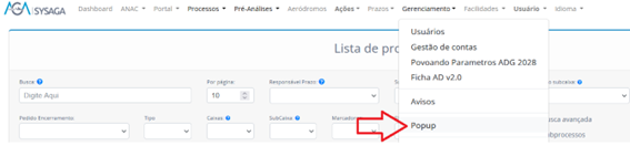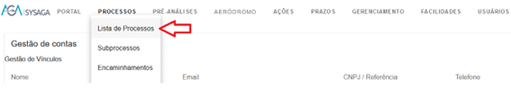 Ao acessar o SysAGA, como usuário interno, a primeira tela – Gestão de contas – contém um menu que não contempla a opção de criação de pop-up, que é a que necessitamos. Para acessar o menu que precisamos, devemos sair da tela de Gestão de contas. Para tanto, clique na opção Processos, Lista de Processos, por exemplo.