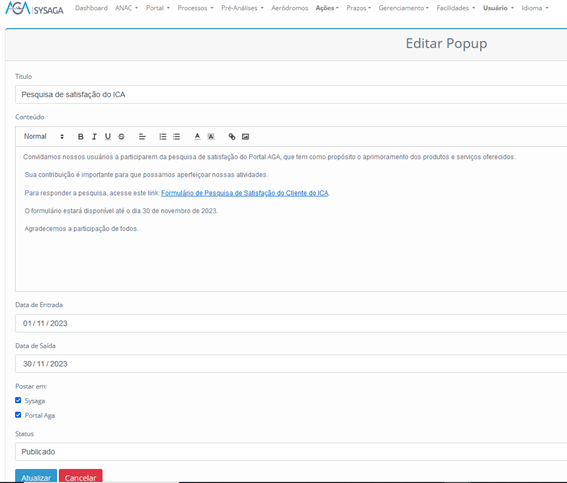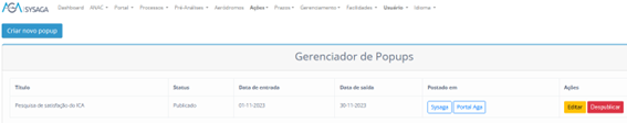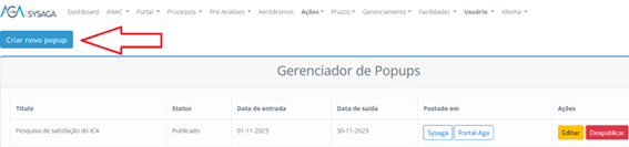Se clicarmos em Despublicar, o Popup será retirado do SysAGA e do Portal AGA.