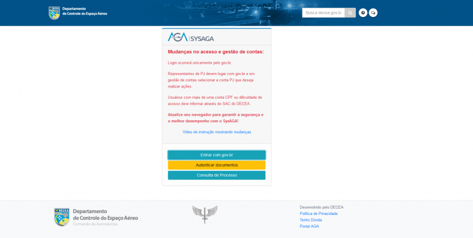 Endereço de acesso: https://sysaga.decea.mil.br/ ou através do Portal AGA: https://aga.decea.mil.br/sysaga